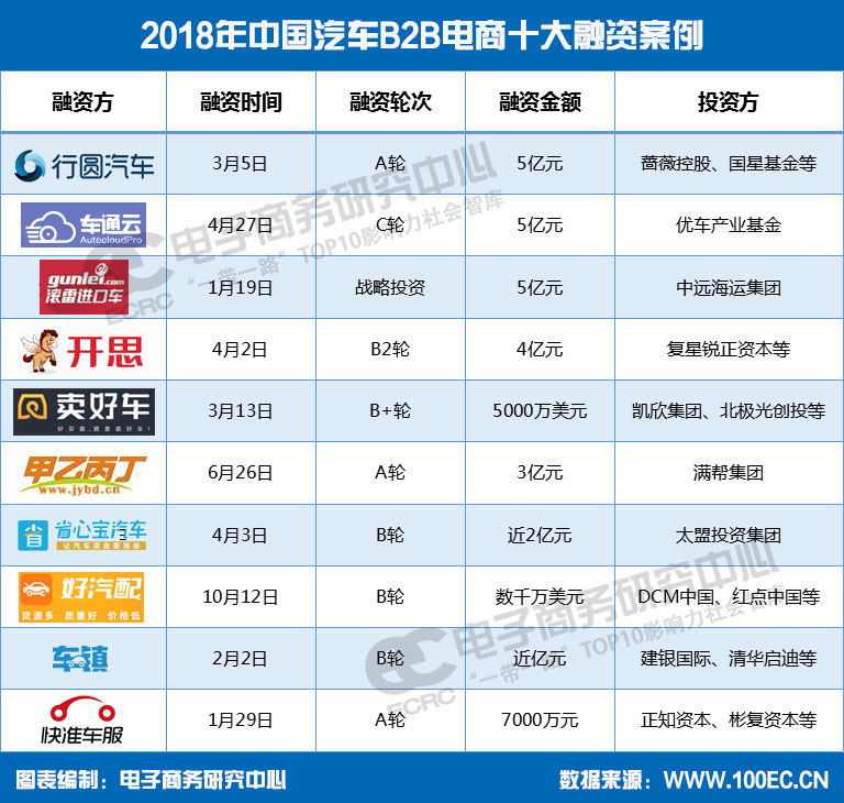 以下為電子商務研究中心對2018年中國汽車B2B電商十大融資案例進行盤點,包括:行圓汽車、車通云、滾雷進口車、開思汽配、賣好車、甲乙丙丁、省心寶汽車、好汽配、車鎮、快準車服等平臺上榜,這十大汽車B2B平臺融資總金額超30.46億元。包括優車庫、一訂有車、平等車市等也在2018年獲得了融資。